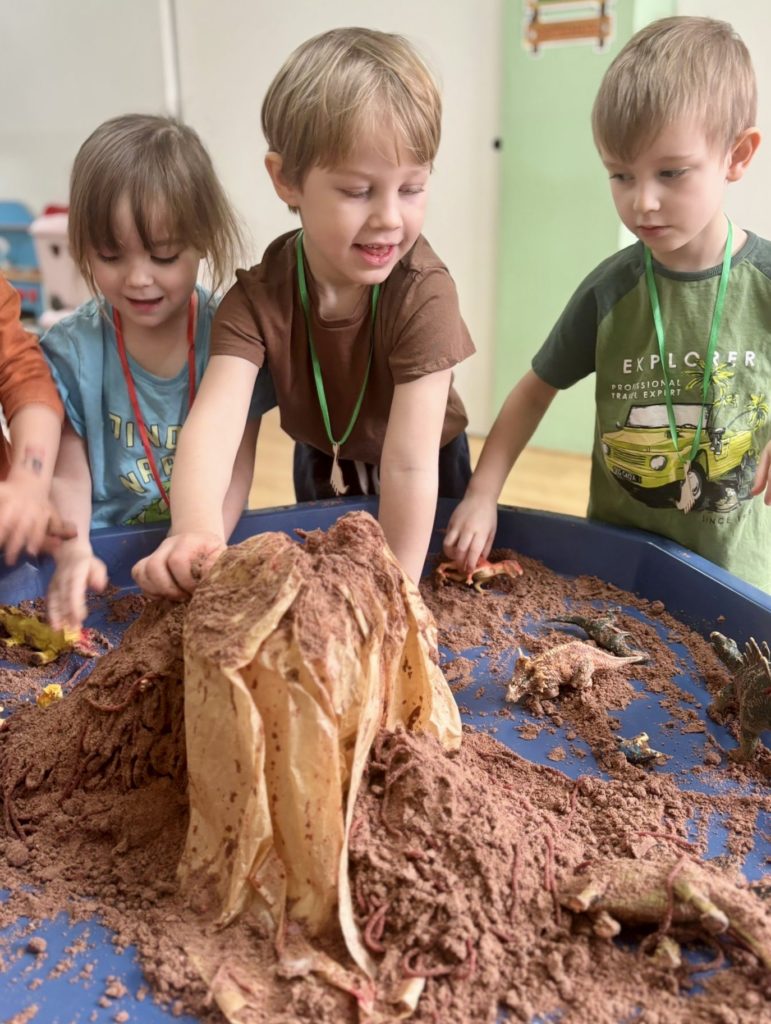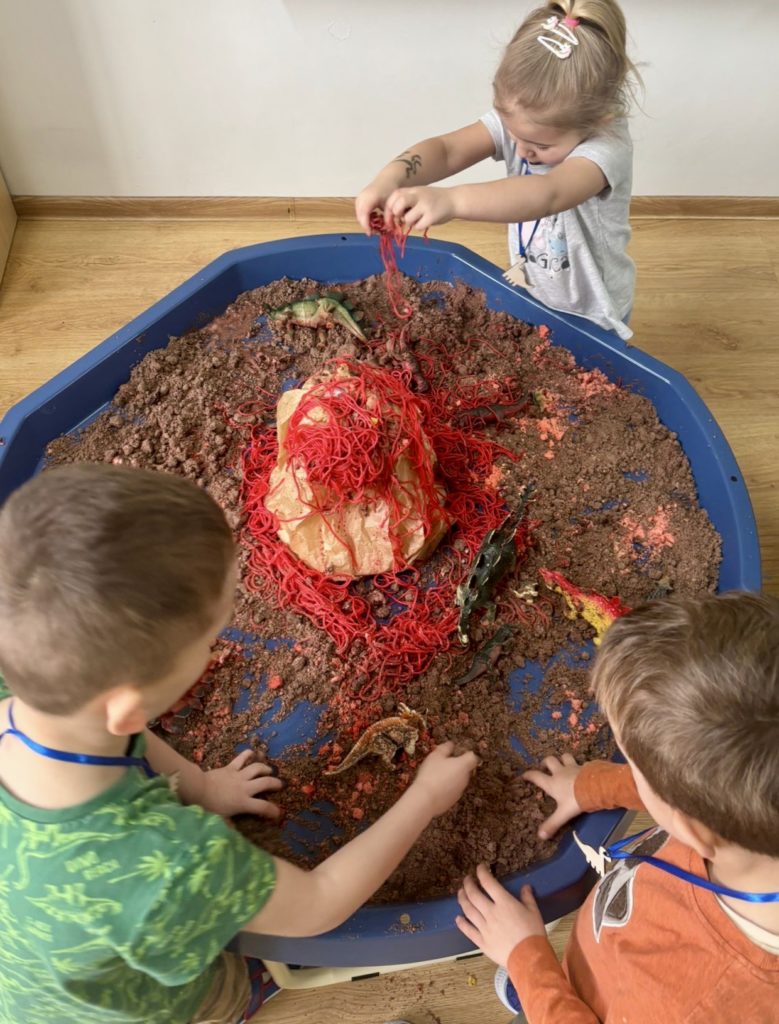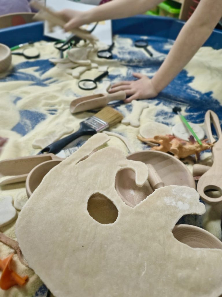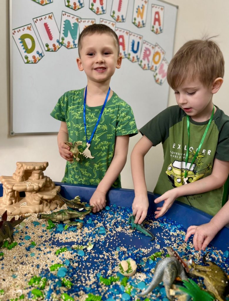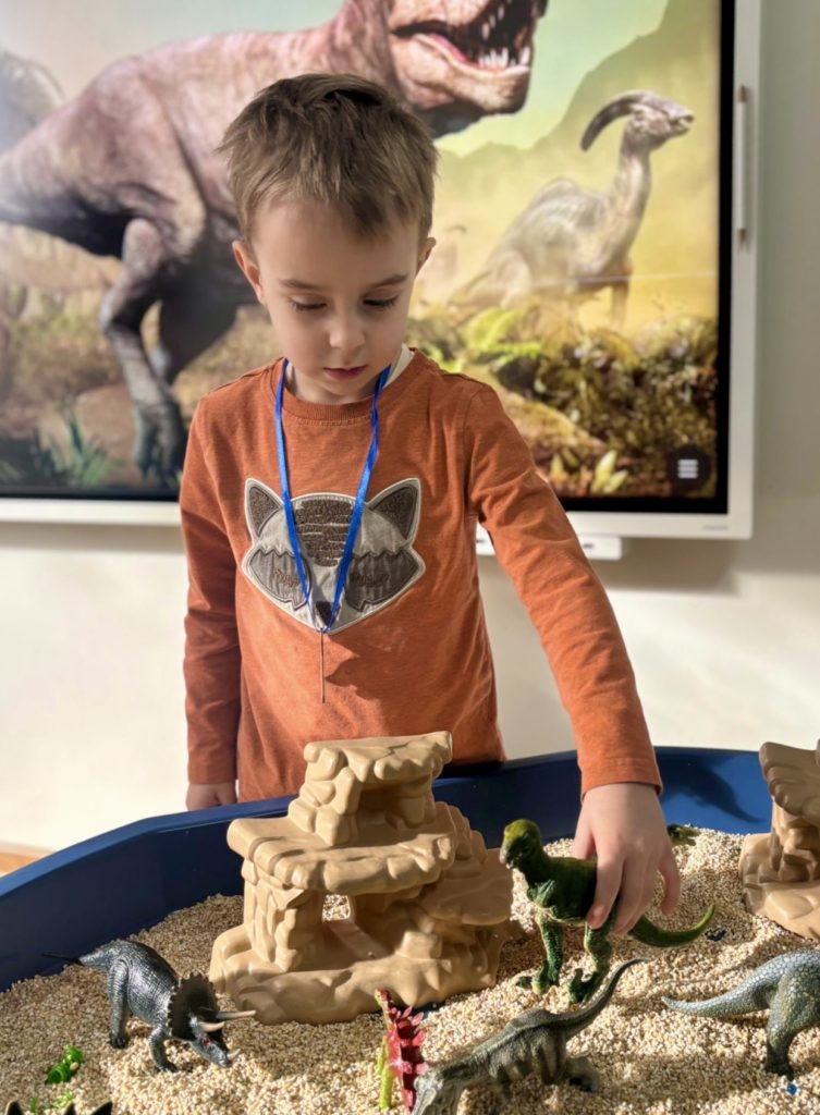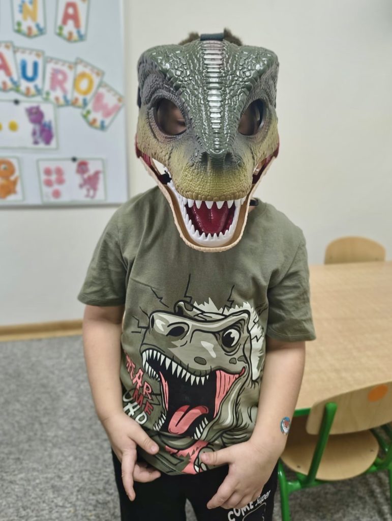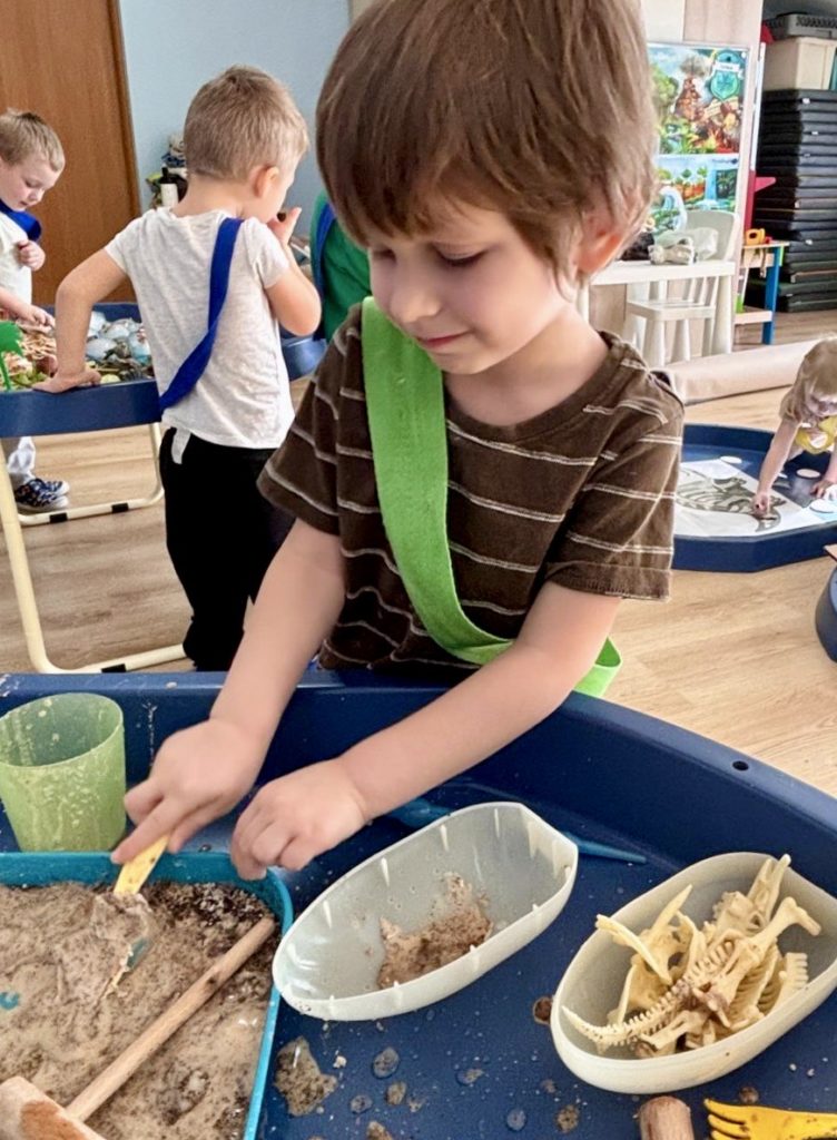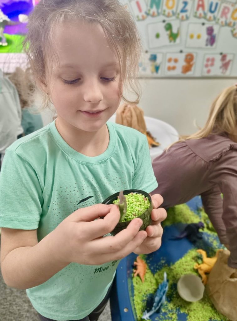 W trakcie zajęć dzieci poszukiwały „skamieniałości”, dotykały różnych faktur, a nawet miały okazję „smakować” elementów świata dinozaurów. Zajęcia wspierały rozwój motoryki małej, koordynacji wzrokowo-ruchowej oraz integracji sensorycznej. Dzieci rozwijały ciekawość świata, uczyły się współpracy i wzbogacały słownictwo związane z tematyką dinozaurów 😀