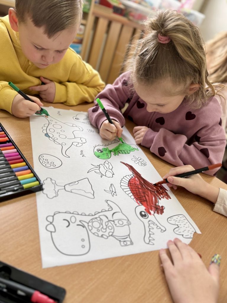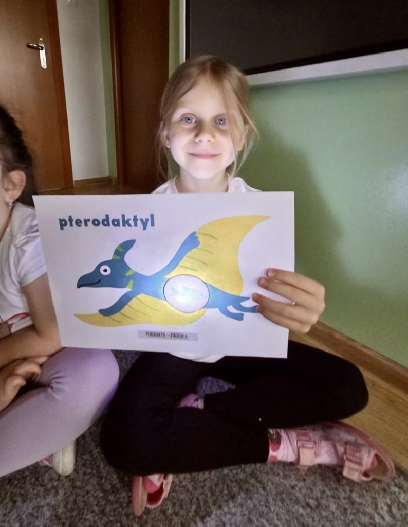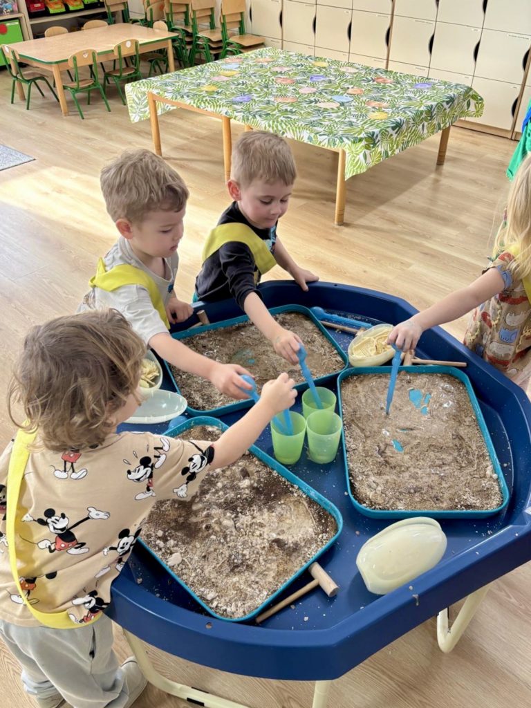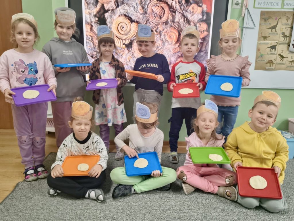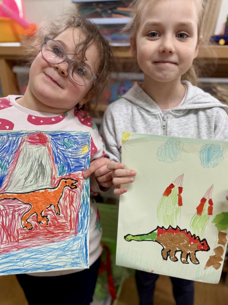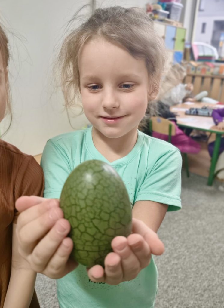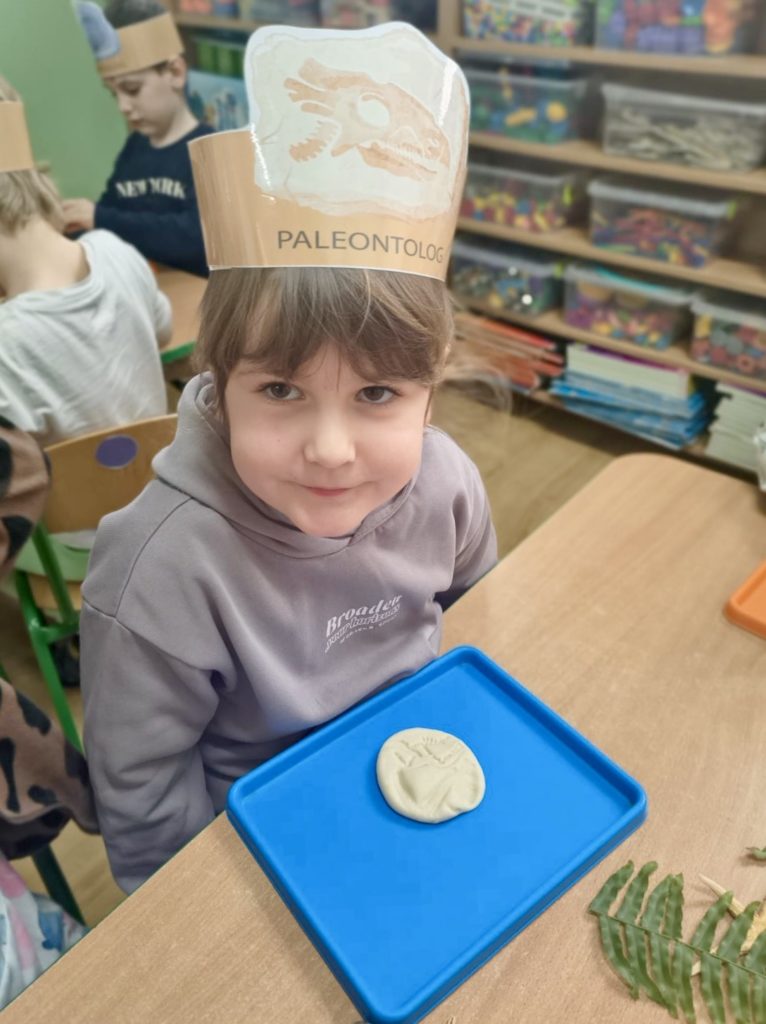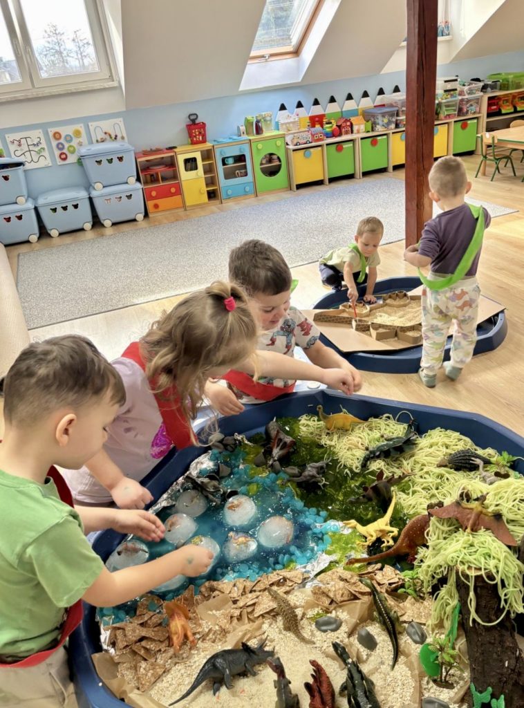 W trakcie zajęć dzieci poszukiwały „skamieniałości”, dotykały różnych faktur, a nawet miały okazję „smakować” elementów świata dinozaurów. Zajęcia wspierały rozwój motoryki małej, koordynacji wzrokowo-ruchowej oraz integracji sensorycznej. Dzieci rozwijały ciekawość świata, uczyły się współpracy i wzbogacały słownictwo związane z tematyką dinozaurów 😀