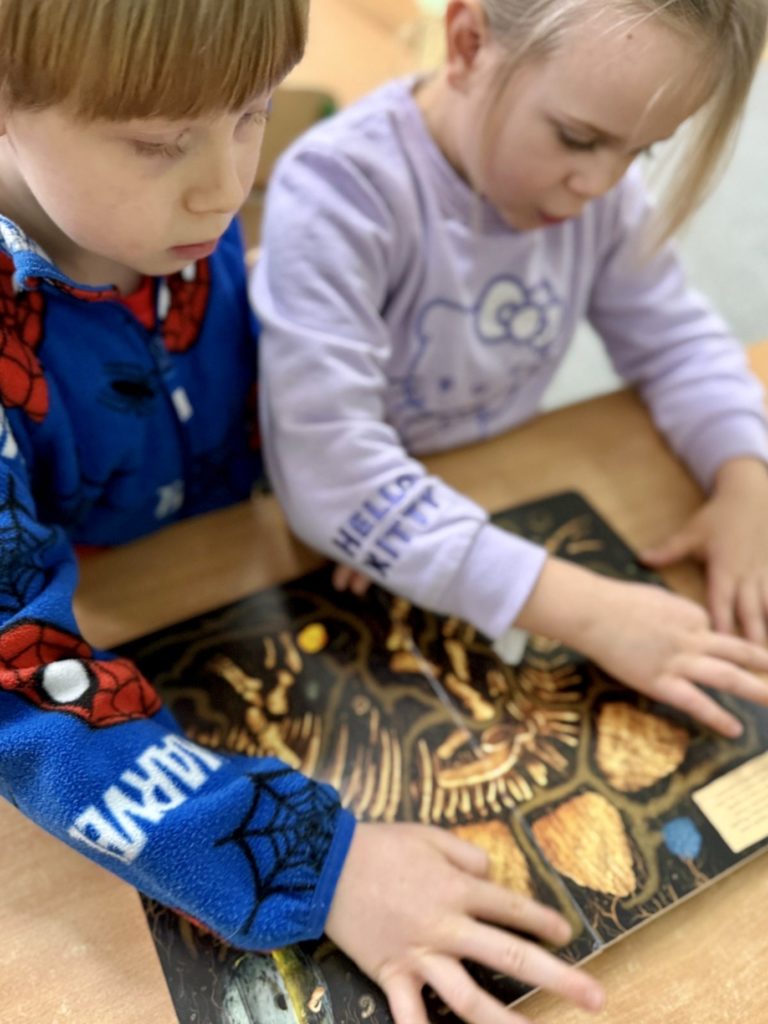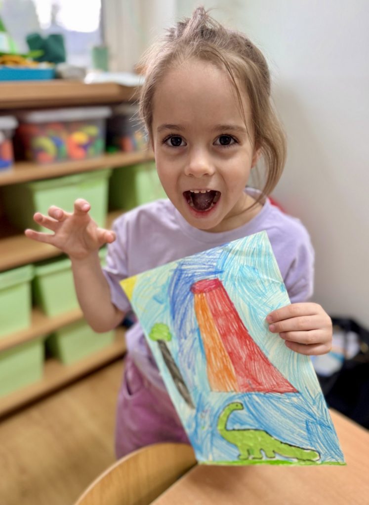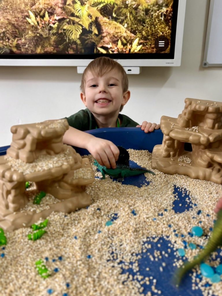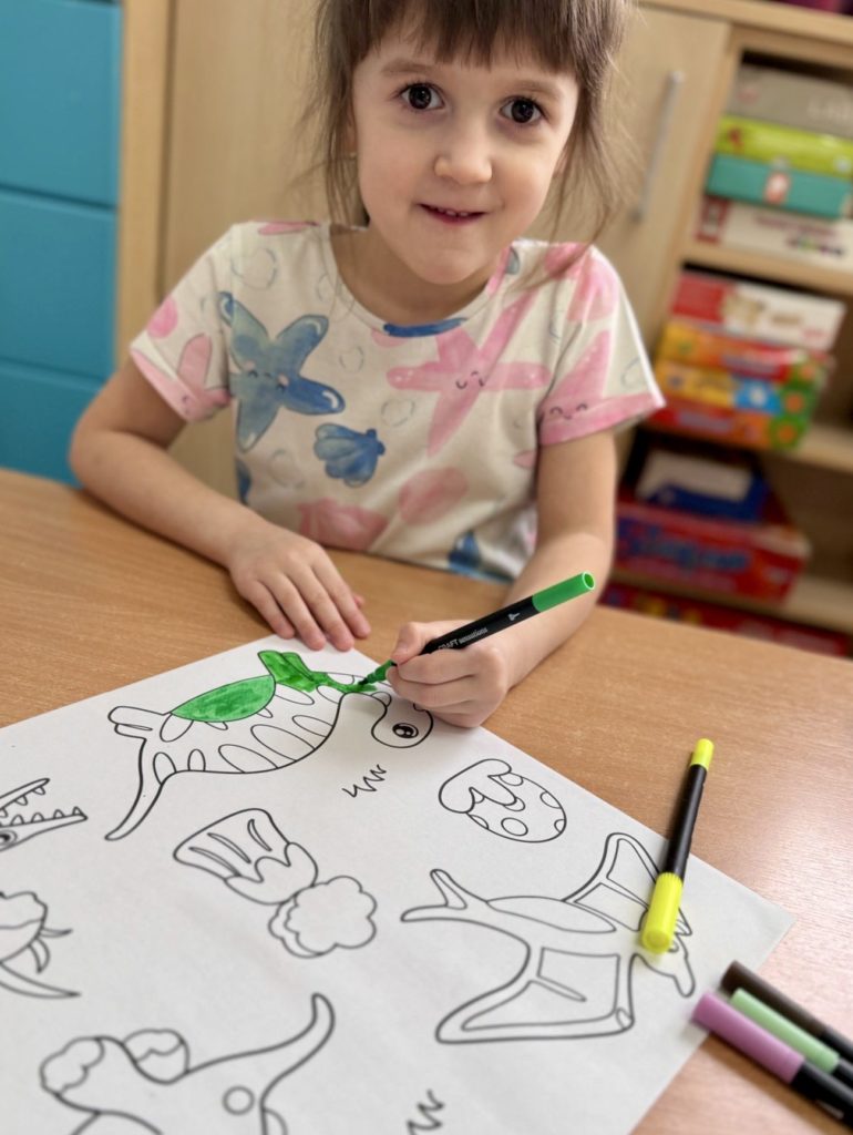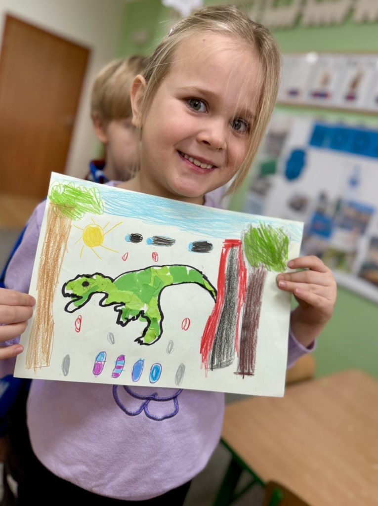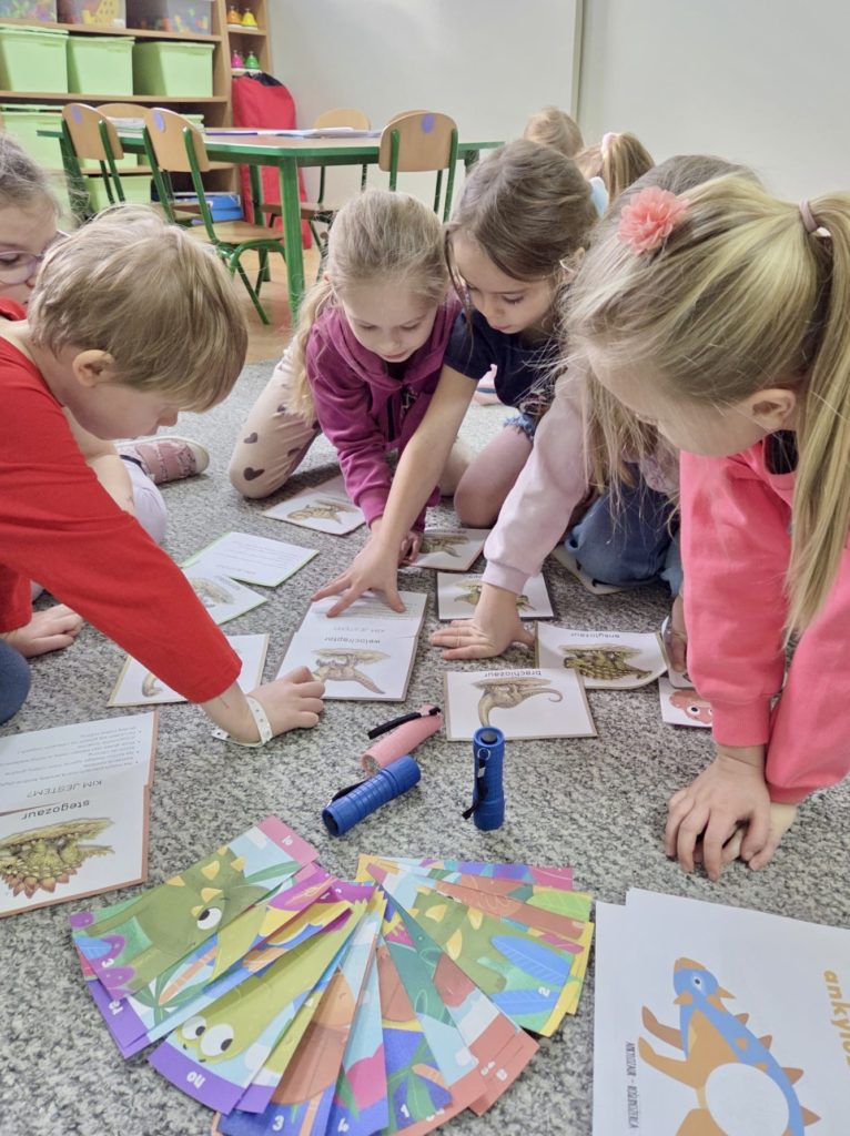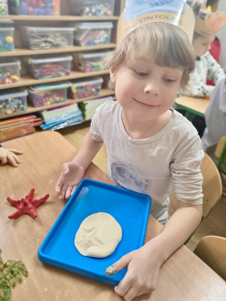 W trakcie zajęć dzieci poszukiwały „skamieniałości”, dotykały różnych faktur, a nawet miały okazję „smakować” elementów świata dinozaurów. Zajęcia wspierały rozwój motoryki małej, koordynacji wzrokowo-ruchowej oraz integracji sensorycznej. Dzieci rozwijały ciekawość świata, uczyły się współpracy i wzbogacały słownictwo związane z tematyką dinozaurów 😀