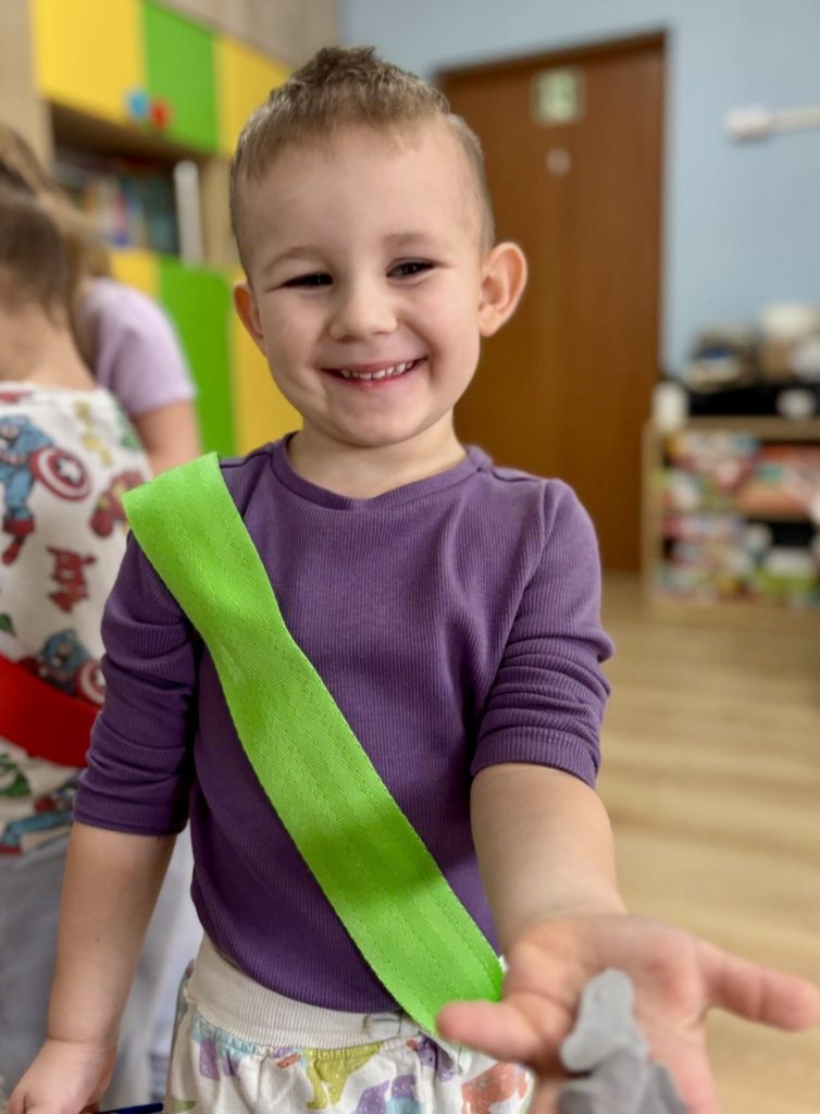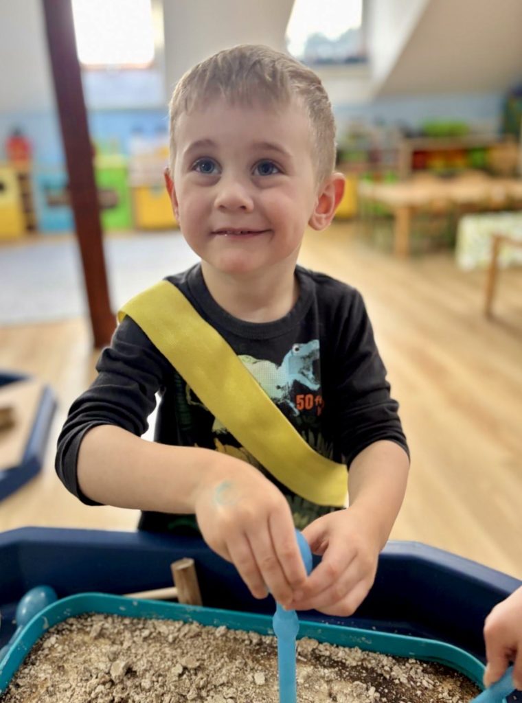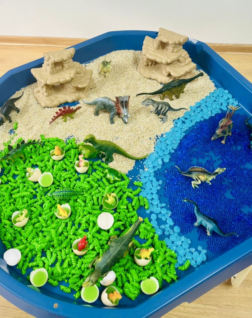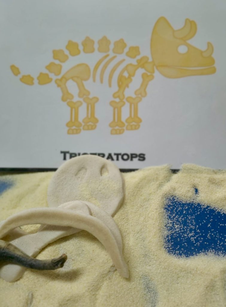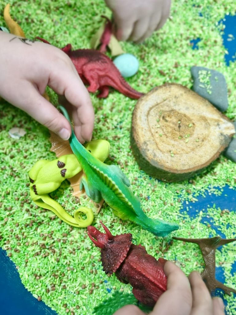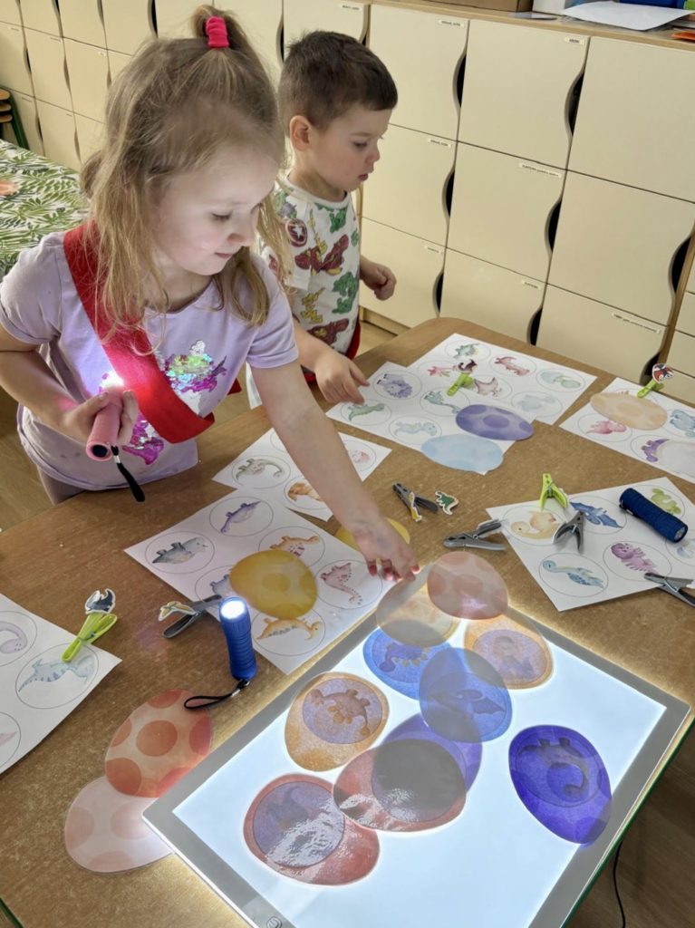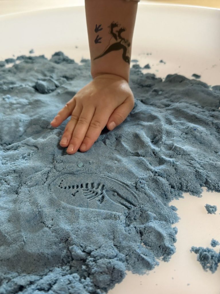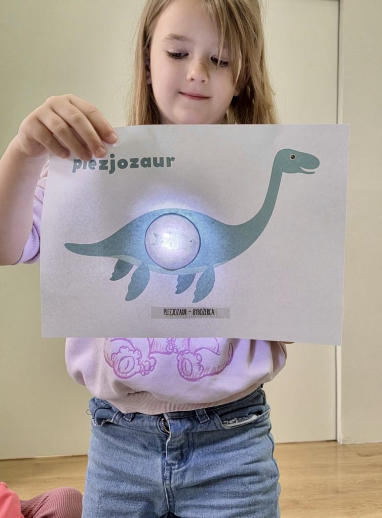 W trakcie zajęć dzieci poszukiwały „skamieniałości”, dotykały różnych faktur, a nawet miały okazję „smakować” elementów świata dinozaurów. Zajęcia wspierały rozwój motoryki małej, koordynacji wzrokowo-ruchowej oraz integracji sensorycznej. Dzieci rozwijały ciekawość świata, uczyły się współpracy i wzbogacały słownictwo związane z tematyką dinozaurów 😀