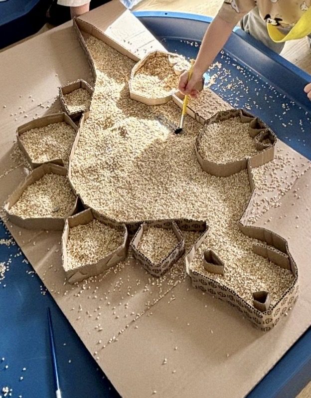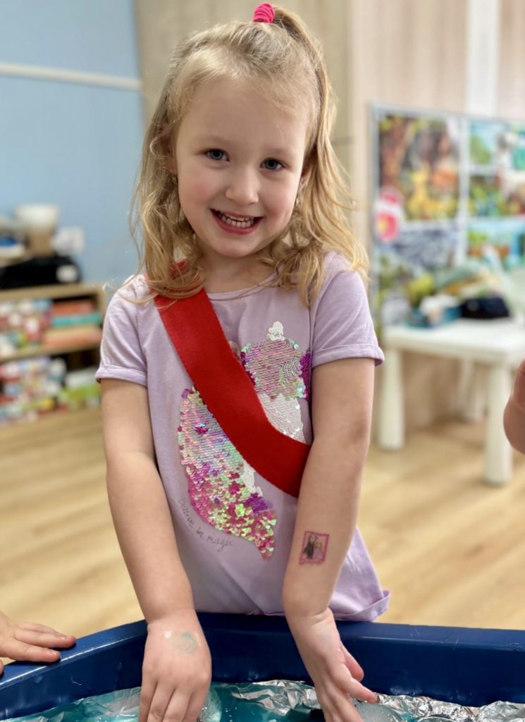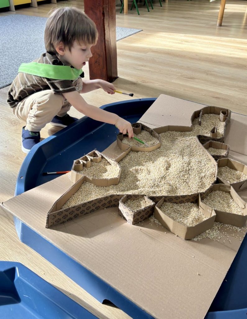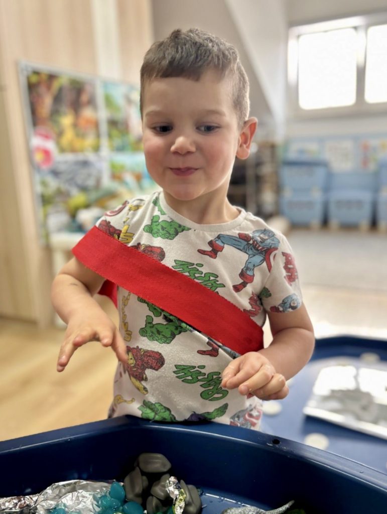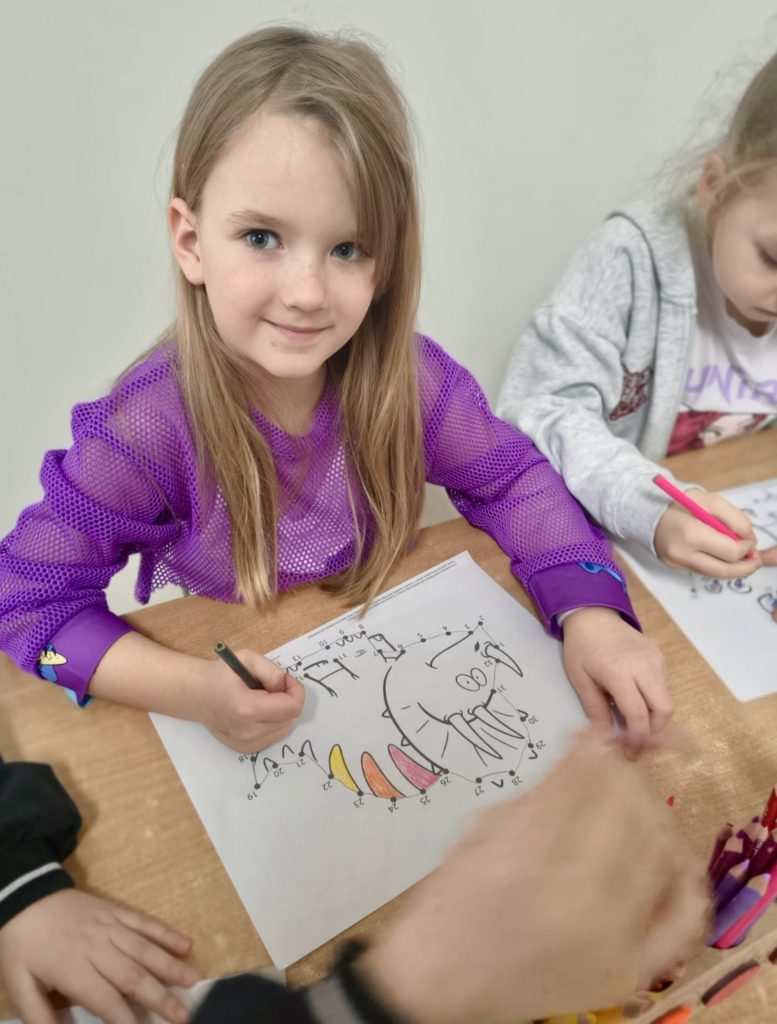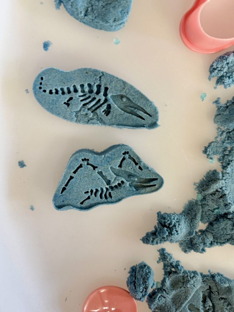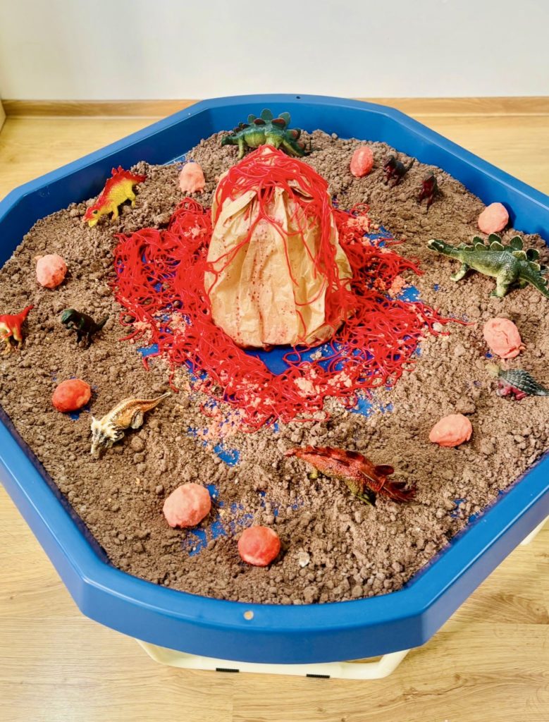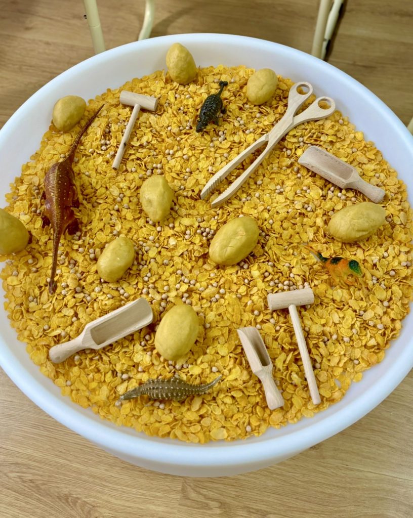 W trakcie zajęć dzieci poszukiwały „skamieniałości”, dotykały różnych faktur, a nawet miały okazję „smakować” elementów świata dinozaurów. Zajęcia wspierały rozwój motoryki małej, koordynacji wzrokowo-ruchowej oraz integracji sensorycznej. Dzieci rozwijały ciekawość świata, uczyły się współpracy i wzbogacały słownictwo związane z tematyką dinozaurów 😀