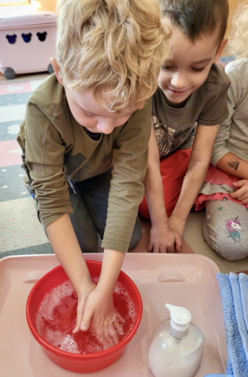 80% wszystkich infekcji przenosimy przez ręce. To właśnie dlatego 15 października jest ustanowionym przez ONZ ŚWIATOWYM DNIEM MYCIA RĄK. W naszym przedszkolu z tej okazji dzieci mogły wykonać szereg eksperymentów i na własnej skórze przekonać się jak ważne jest mycie rąk 🙂