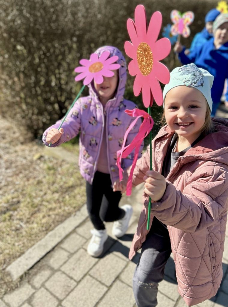 W ubiegłym tygodniu, zgodnie z tradycją, przywitaliśmy Panią Wiosnę. Dzieci śpiewając wiosenne piosenki i machając kwiatami oznajmili wszystkim nadejście zielonej wiosny. Oprócz uroczystego wiosennego spaceru przedszkolaki wzięły również udział w licznych aktywnościach plastyczno-sensorycznych, podczas których każdy mógł poczuć wiosnę na własnej skórze 🙂